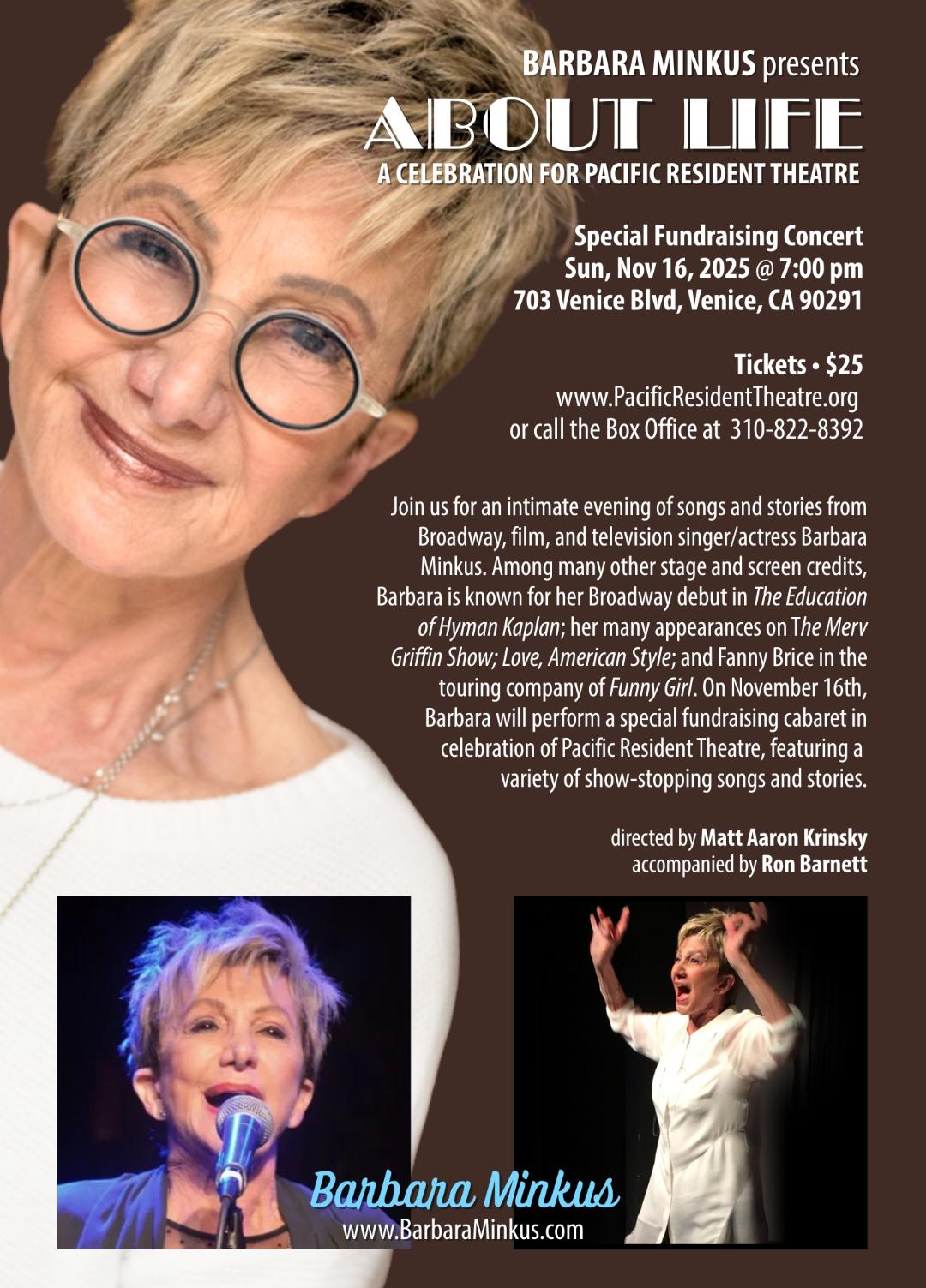 Join us for an intimate evening of songs and stories from Broadway, film, and television singer/actress Barbara Minkus. Among many other stage and screen credits, Barbara is known for her Broadway debut in The Education of Hyman Kaplan; her many appearances on The Merv Griffin Show; Love, American Style; and Fanny Brice in the touring company of Funny Girl. On November 16th, Barbara will perform a special fundraising cabaret in celebration of Pacific Resident Theatre, featuring a variety of show-stopping songs and stories.